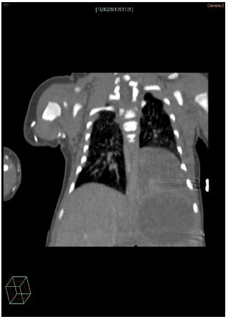 Due to the good clinical conditions, we started a LUS follow-up. At one month of life a CT scan confirmed the pulmonary malformation: an extralobar pulmonary sequestration with abnormal vessel from the thoracic aorta and venous drainage in azygos and emiazygos veins was identified in the lower pulmonary left lobe (Figure 2).