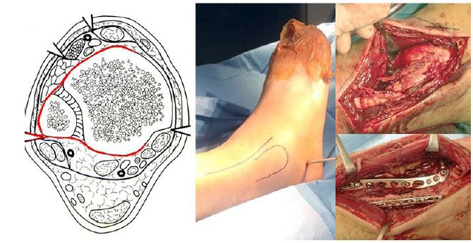 In very comminuted fractures with multiple fragments, it may be necessary to address the fracture in conjunction with anterior and posterior approaches; very rarely doing two separate surgeries. Significant bone loss and comminution may require bone grafting from autologous or benched bone material. Bone transport may also present a viable option when using circular frames. Primary arthrodesis only serves as a salvage procedure in a very selected group of patients [30].
