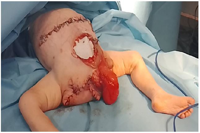 The patient developed acute renal failure in the first days of life, characterized by anuria and elevated creatinine levels. A multidisciplinary decision was made to perform partial excision of the parasitic structures, preserving vital anatomy of the autosite. Surgery included resection of the lower and upper limbs and the majority of the pelvic mass. Postoperative urine output resumed promptly, and renal function normalized within 72 hours.