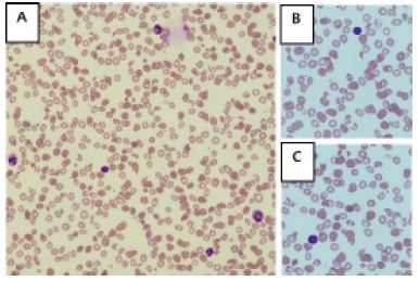 He was found to have severe thrombocytopenia, and anemia. The hemoglobin concentration was 5.0 g/dL, platelet count was 12,000/μL, reticulocyte count was 5.72 %, and the peripheral blood smear showed schistocytes (>2%) (Figure 1). Lactate Dehydrogenase (LDH) was 1890 U/L, and the coombs direct and indirect tests were negative. He also had electrolyte imbalance and azotemia, hypoproteinemia: sodium was 138 mmol/L, potassium was 5.6 mmol/dL, calcium was 7.0 mg/dL, phosphorus was 4.9 mg/dL, BUN was 74 mg/dL, Creatinine was 4.25 mg/dL, total protein 4.7 g/dL, albumin 1.8 g/dL. He also had coagulopathy: PT INR 1.51, APTT 37.0 seconds, fibrinogen 109.9 mg/dL. Moreover, his lab showed elevated C-Reactive Protein (CRP) (8.5 mg/dL) and cardiac markers: CK-MB 6.51 ng/mL, Troponin I 0.47 ng/mL, NT ProBNP 7407 pg/mL. A urinalysis showed albuminuria (1+), Pyuria (2+).