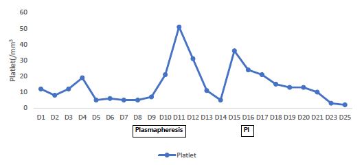 After administration, his symptoms (general weakness, mental drowsiness, skin necrosis) got worse, and laboratory test results showed microangiopathic hemolytic anemia (MAHA) and thrombocytopenia. Red Blood Cell (RBC), platlet transfusion was done. Meanwhile, additional laboratory test was done: ADAMTS13 (a disintegrin and metalloprotease with thrombospondin type 1 repeats member 13) was 20.9, haptoglobin was <10 mg/dL. These findings were suspected to be due to sunitinib induced TTP. Renal Replacement Therapy (RRT) was initiated, because of aggravation of azotemia with poor urine output. Followed lab showed improvement for anemia, but thrombocytopenia got worse. He showed confused mentality, skin and soft tissue necrosis with no improvement despite continuing RRT, drug withdrawal, antibiotics covering and conservative manage. Plasmapheresis was done for managing TTP. Followed lab showed improvement of thrombocytopenia and coaguloapthy, but it discontinued because of cost issue (Figure 2).