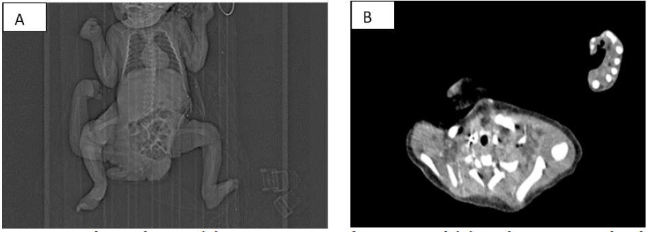 Initial investigations revealed an omphalocele, a left colostomy for neonatal colonic perforation, and exstrophy of the bladder. MRI and CT imaging showed that the parasite contained five vertebrae, two ribs, a complete right lower limb with pelvic bone, a partial upper limb with hemiscapula, and a functional kidney and bladder system. Vascularization was derived from both internal iliac arteries of the autosite. The anteroposterior infantogram and the bony axial scan clearly illustrated the parasitic structures and vertebral segment (Figure 1).