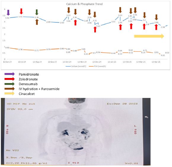 Our patient demonstrated partial and short-lived responses to each modality, with recurrent hypercalcemia despite combination therapy. The persistently elevated 1,25-dihydroxy vitamin D likely contributed to the hypercalcemia, potentially due to unregulated PTH-mediated conversion. Additionally, hydration and loop diuretics provided only temporary relief and required repeated administration. The case underscores the limited and transient efficacy of current medical therapies in severe PHPT when surgery is contraindicated.